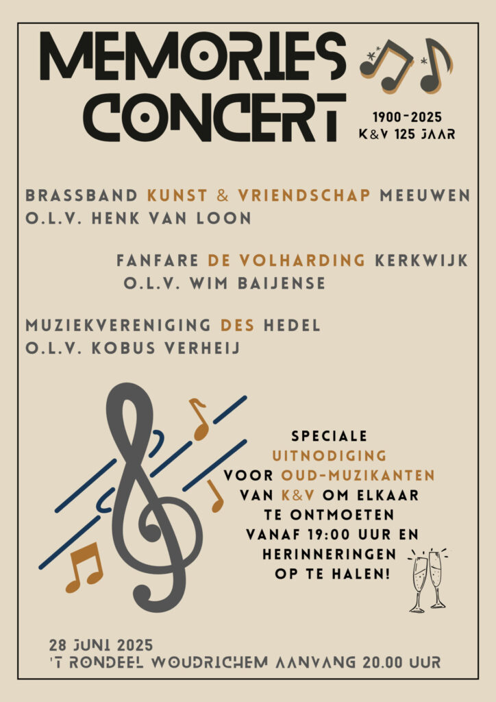 Memories Concert 28 juni 2025 Om alvast in de agenda te noteren: zaterdag 28 juni 2025 Memories Concert met Fanfare de Volharding Kerkwijk o.l.v. Wim Baijense en muziekvereniging DES Hedel o.l.v. Kobus Verheij. Kunst & Vriendschap bestaat 125 jaar en dat vieren we onder andere deze avond met 2 oud dirigenten van K&V met hun […]